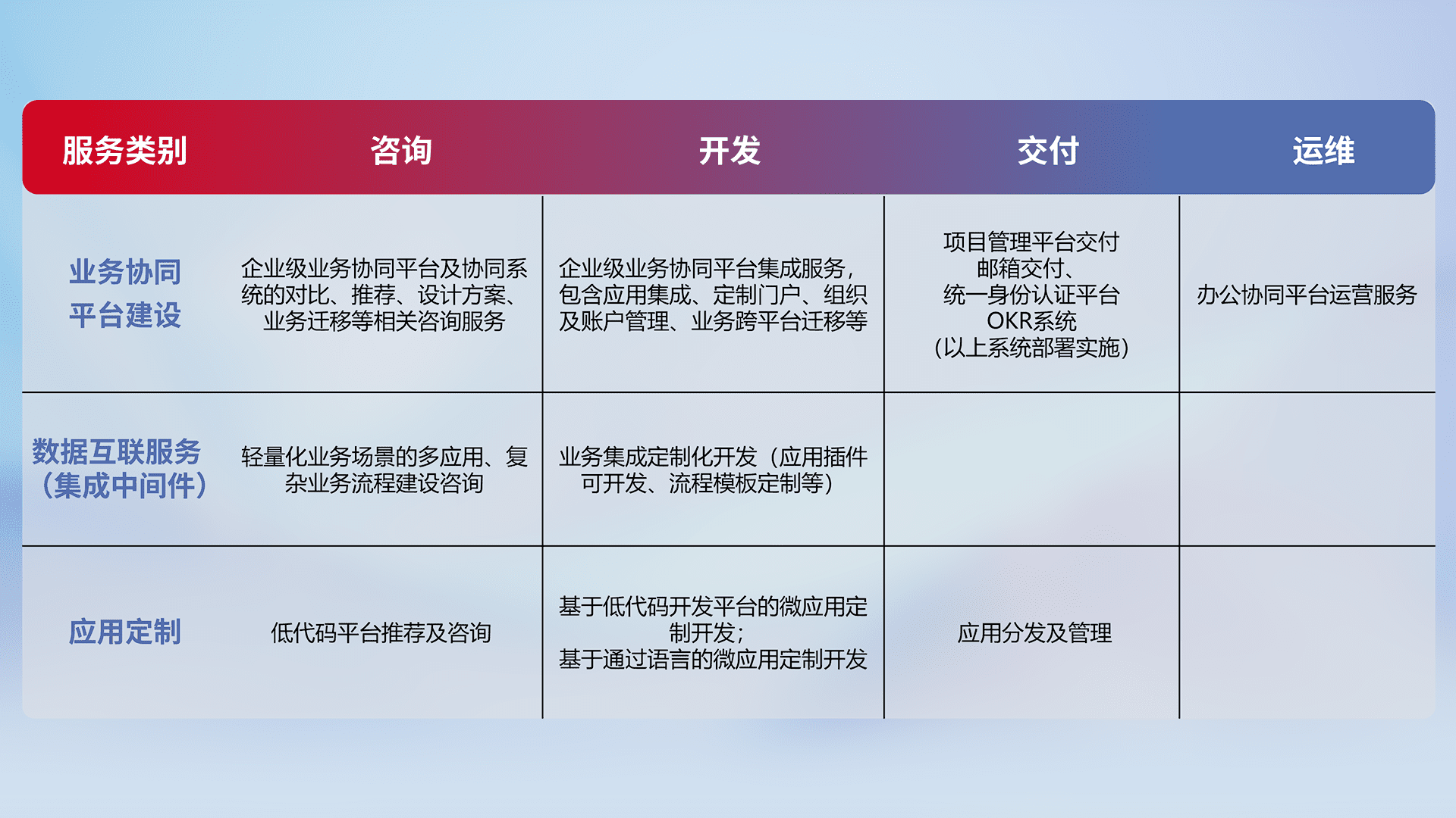 针对钉钉、、、、企微、、、、IDaas等平台级产品提供产品的规划、、、方案、、、、交付、、、定制化开发等服务,,,实现如统一协同办公、、、智能客户服务、、、混合会议管理、、、智能数据查询、、、等业务场景,,,,实现数字化转型。。。